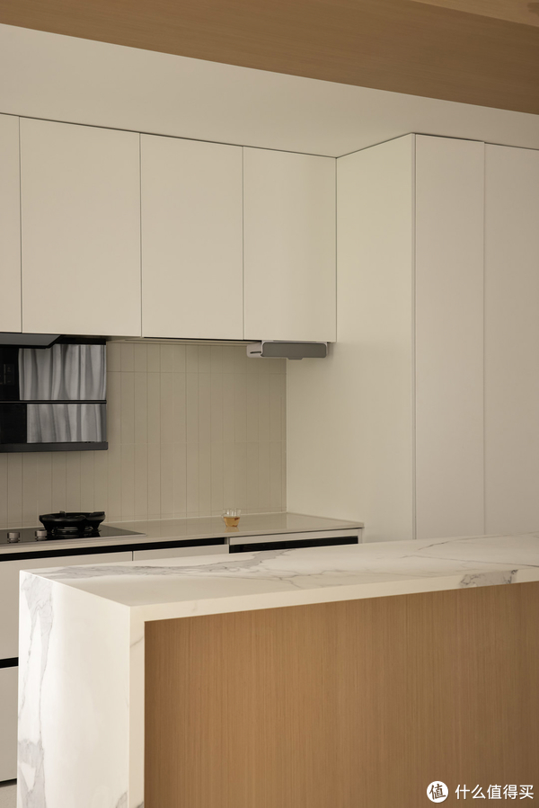 厨房是从玄关延伸过来的白色吊柜,与餐厅间用了吧台进行了分隔,在现代生活里,吧台还是能带来不少乐趣的。