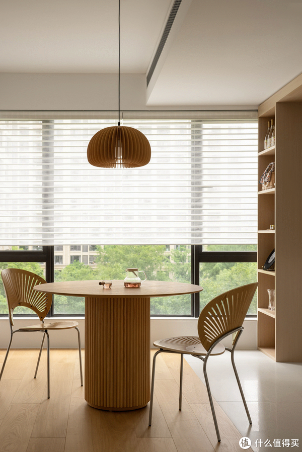 餐厅里用了一张直径1米的原木圆桌,搭配着南瓜灯,轻松就营造出温馨、浪漫的用餐氛围。可见整个家在白墙和原木材质及家具的烘托下,赋予了空间素雅洁净的暖意,营造了一个质朴自然且温润如玉的效果,一进屋真的令人极度舒适。