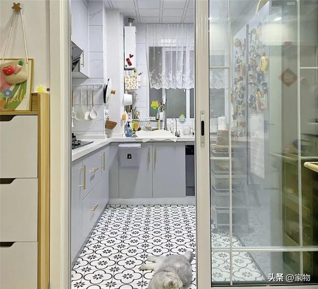 餐桌对面的厨房,用一扇玻璃推拉门进行隔断,既不会像硬隔断那样阻隔视觉,又能避免油烟逸散到室内,在保证通透明快感的同时起到了有效的分隔区域作用。