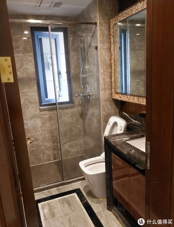 最后我们来看看卫生间,是不是有一种四五星级大酒店的既视感。卫生间的空间其实并不大,只是效果比较华丽,视觉效果方面比较到位。淋浴区在最里面,装了玻璃隔断来实现干湿分离。