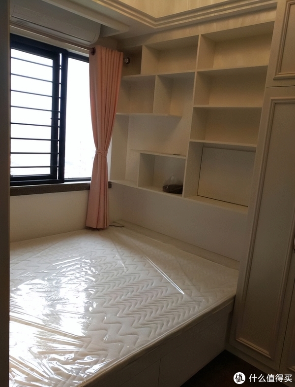 次卧设计了榻榻米,床和收纳柜子、收纳架都连接一体的那种。对于小空间来说,设计组合榻榻米是最好的选择。因为榻榻米的效果本来就时尚好看,收纳功能还强,最主要是可以整合所有碎片化空间,让小空间的利用得到极致的发挥。