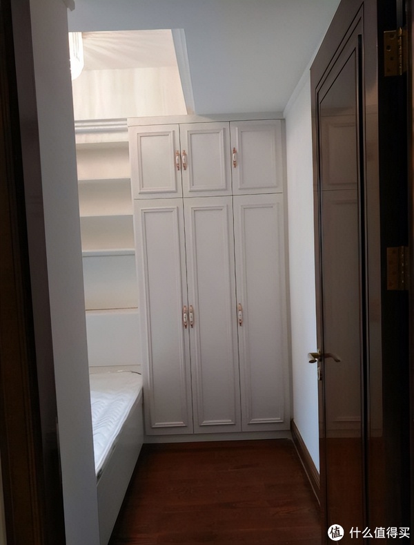 次卧的天花板也做了灯带吊顶,和收纳架连着的收纳衣柜正好对着门。