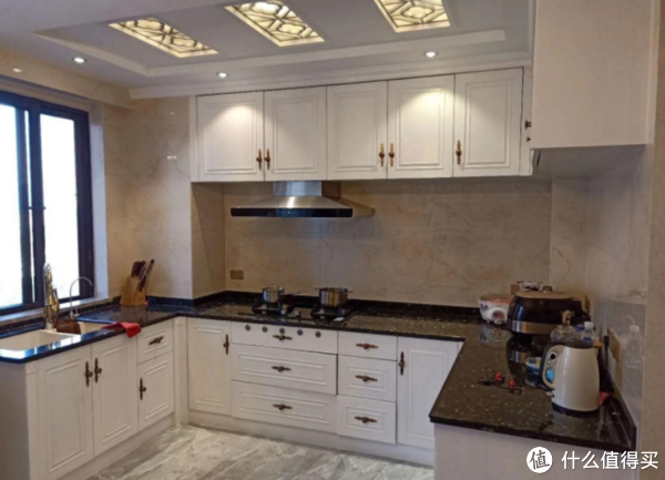 U型大厨房,就在餐厅的边上。黑白色主基调的工作台和橱柜吊柜,墙壁上还贴满了时尚耐脏的瓷砖,整体颜值和使用效果都特别到位。