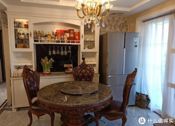 开放式餐厅,一套挺大的转盘餐桌椅摆放在中间,边上还有不少的空间。餐厅最棒的当属那面收纳餐边柜,不仅好看,还有非常强大的收纳功能。