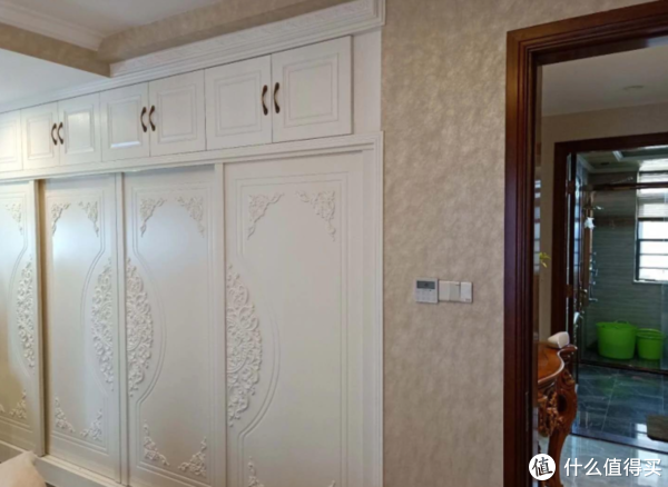 为了实现足够的收纳功能,定制了一整面墙的嵌入式衣柜,最上面的一排是吊柜。