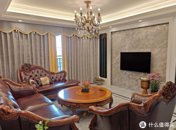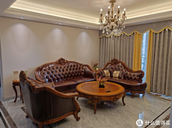 客厅的买的是真皮的沙发,这套大沙发据说就花了3万块左右。大空间搭配奢华家具,气质油然而生。