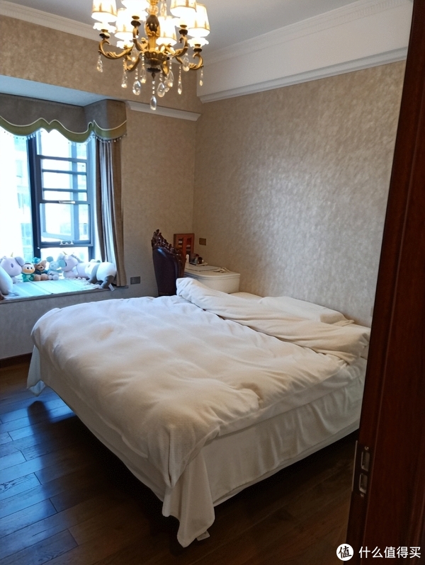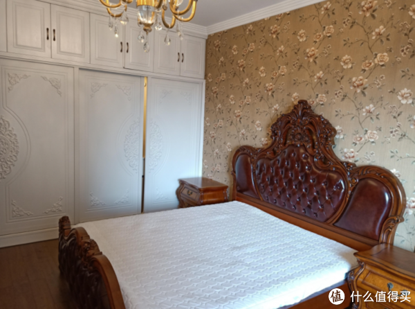 卧室铺的都是木地板,墙壁上贴满了墙纸。下面我们看到的是主卧室,空间特别的大,奢华的大软床。