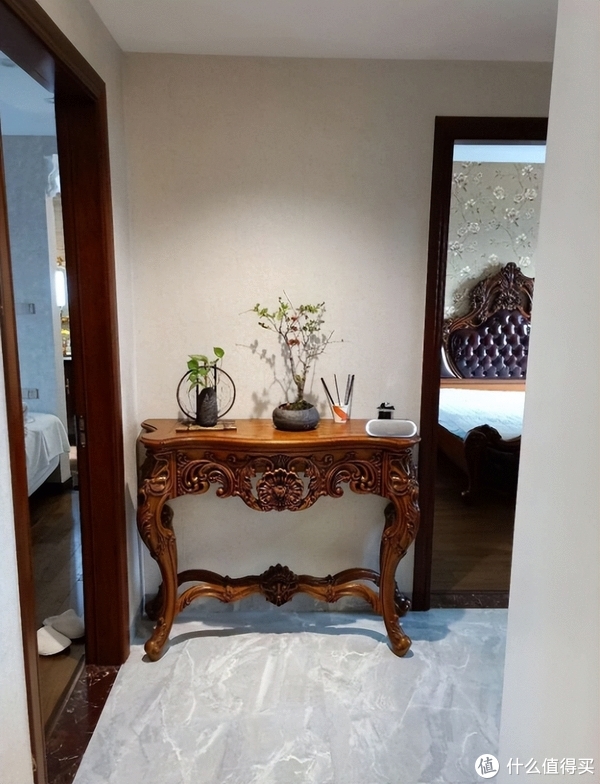 这是通往房间的走廊,尽头摆放了一张装饰的小桌子。