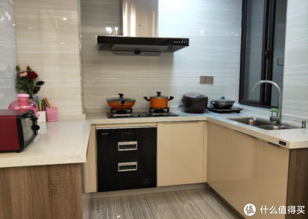 餐厅边上就是厨房,厨房也是开放式格局,是U型的那种。厨房只装了橱柜,上半部分都是华丽好看的瓷砖。因为没有装吊柜,所以收纳功能可能稍微差点,因此平时东西不能随便丢。