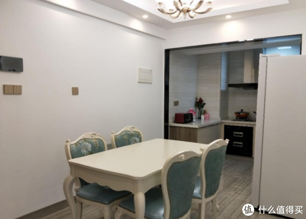 这边是开放式小餐厅,餐厅效果是标准的简洁清爽,瓷砖地板搭配大白墙,天花板也有一个独立的灯带吊顶。餐厅的装饰效果虽然简洁,但是这套简欧风格餐桌椅却配合得恰到好处。