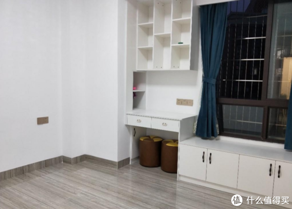 这边是次卧,效果和主卧室基本上差不多,都是瓷砖地板搭配大白墙。不过窗户下面定制了组合的收纳书桌和书柜,还有定制的收纳衣柜。