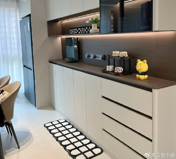 厨房做免把手的设计后,颜值高不说,关键不会藏污纳垢,可以学习一下。