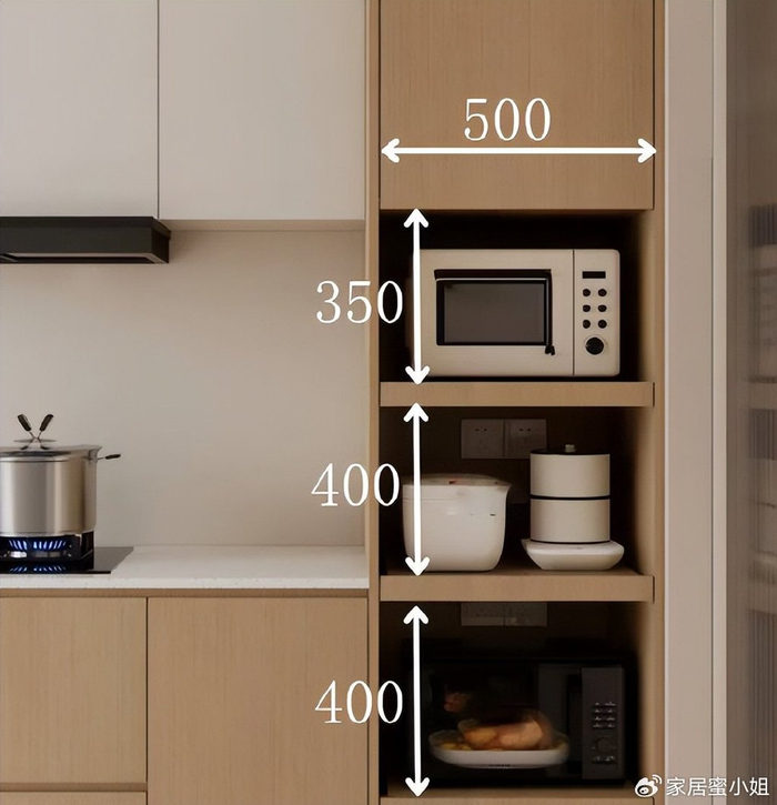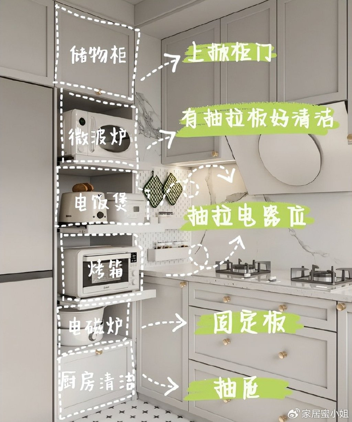 厨房去做高柜,高度预留50公分左右就够用,宽度根据家电尺寸去决定,