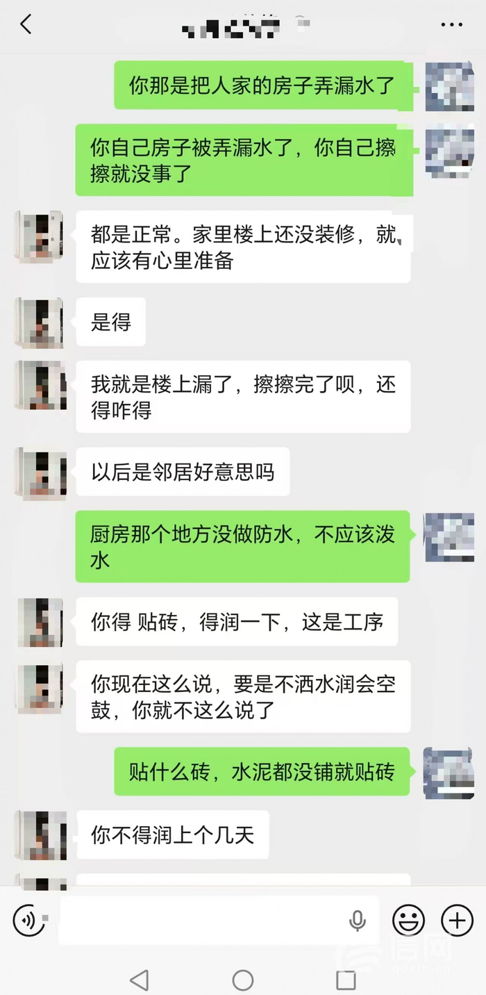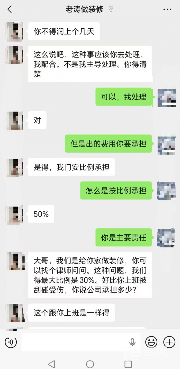 邻居家漏水情况。(来源:受访者)装修的活儿刚开始干就闯了祸,张先生赶紧联系工作室解决问题。在张先生提供的聊天截图里,信号新闻看到,微信名为“老涛做装修”的人对张先生表示,这种事应该由业主自行处理,工作室只能按比例赔偿,而且张先生应承担主要责任。