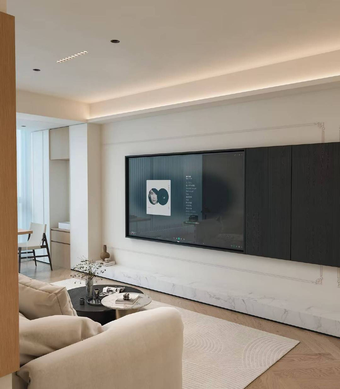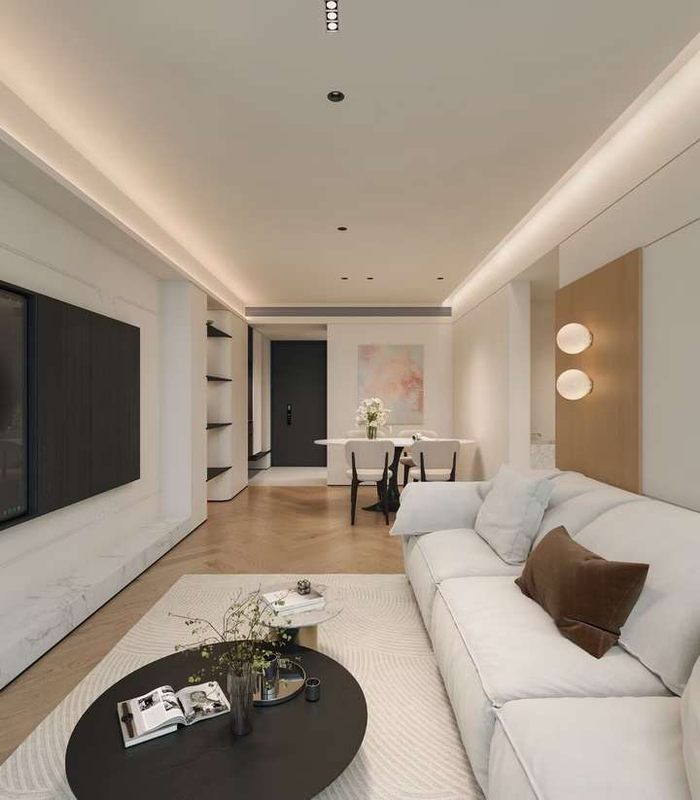 推开门,浅暖的底色像一层柔焦滤镜,裹住了整个空间。客厅里,奶白色沙发陷进蓬松的软包,深棕抱枕是恰到好处的色彩落点;电视墙用深色木面藏起收纳,下方的大理石地台与地板的人字拼纹碰撞出细腻质感,连灯光都懂“留白”——磁吸轨道灯与吊顶氛围灯带,把光线揉成了温柔的雾。