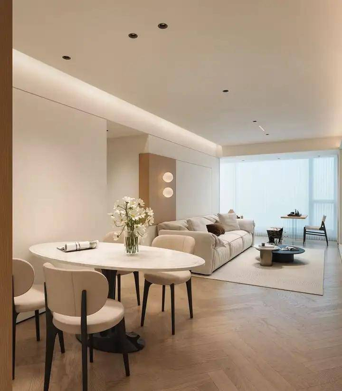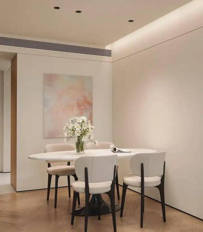 视线往餐厅延伸,圆餐桌的大理石台面泛着细腻光泽,搭配线条利落的餐椅,连摆放的白花都显得松弛;走廊处的开放式置物架、墙面的极简壁灯,没有多余装饰,却让空间的呼吸感刚刚好。