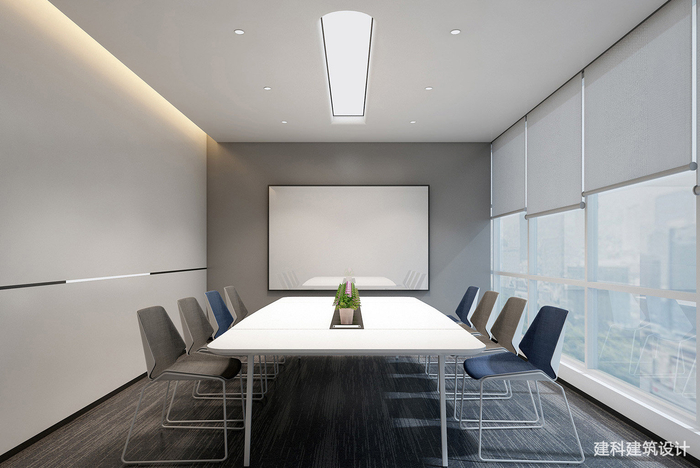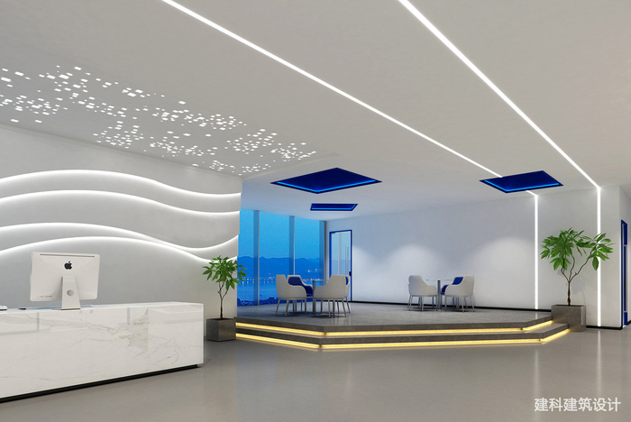 当光线以流线型生长,当空间与科技呼吸同频,我们把 “未来感”,种进每一寸肌理里。天花板星点矩阵如代码阵列,墙面波浪灯带随动线舒展,台阶暗藏光轨似数据流动,让空间成为「会呼吸的科技载体」。大理石前台的冷冽质感,碰撞蓝白主调的理性克制,搭配通透落地窗引自然光入境,这里既是接待场,也是科技美学的展厅。抬高式洽谈区以暖光勾勒边界,在冷调科技感中嵌入松弛感,让商务沟通也能适配 “轻量、舒适” 的当代节奏。