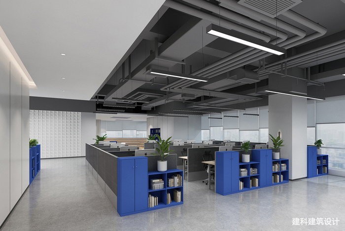 这里不是刻板的格子间,而是科技公司的灵感发电站。裸露的管线是理性的注脚,利落的灯轨织就光影韵律,冷调水泥地承托着高效节奏;而那抹撞色蓝,则是藏在秩序里的创造力开关:储物格化身知识充电站,绿植在硬朗线条里洇出呼吸感,通透窗景让思维随时与城市同频。