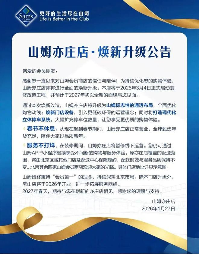 山姆会员商店亦庄店(以下简称“山姆亦庄店”)将于2026年3月4日正式启动装修改造工程,并预计于2027年初焕新亮相。