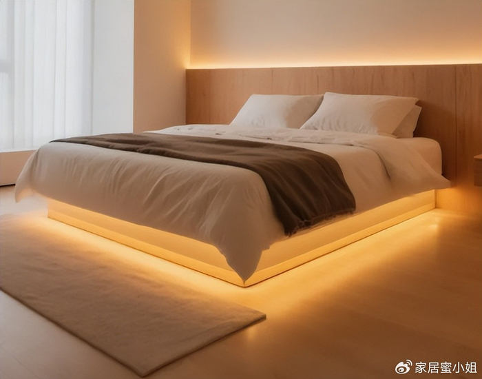 从效果图来看,悬浮床下面搭配上灯带,氛围感立马就上来了,睡觉都觉得幸福。