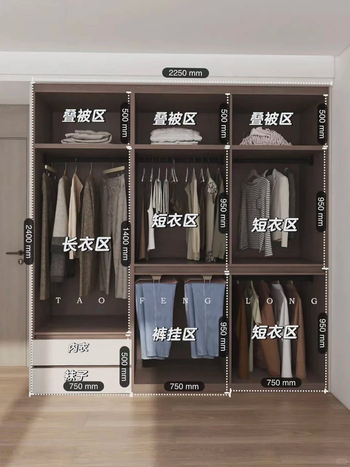 设计家中的衣柜内部空间时,一定要设计85%以上的挂衣区,多多增加挂衣区就可减少叠衣区。